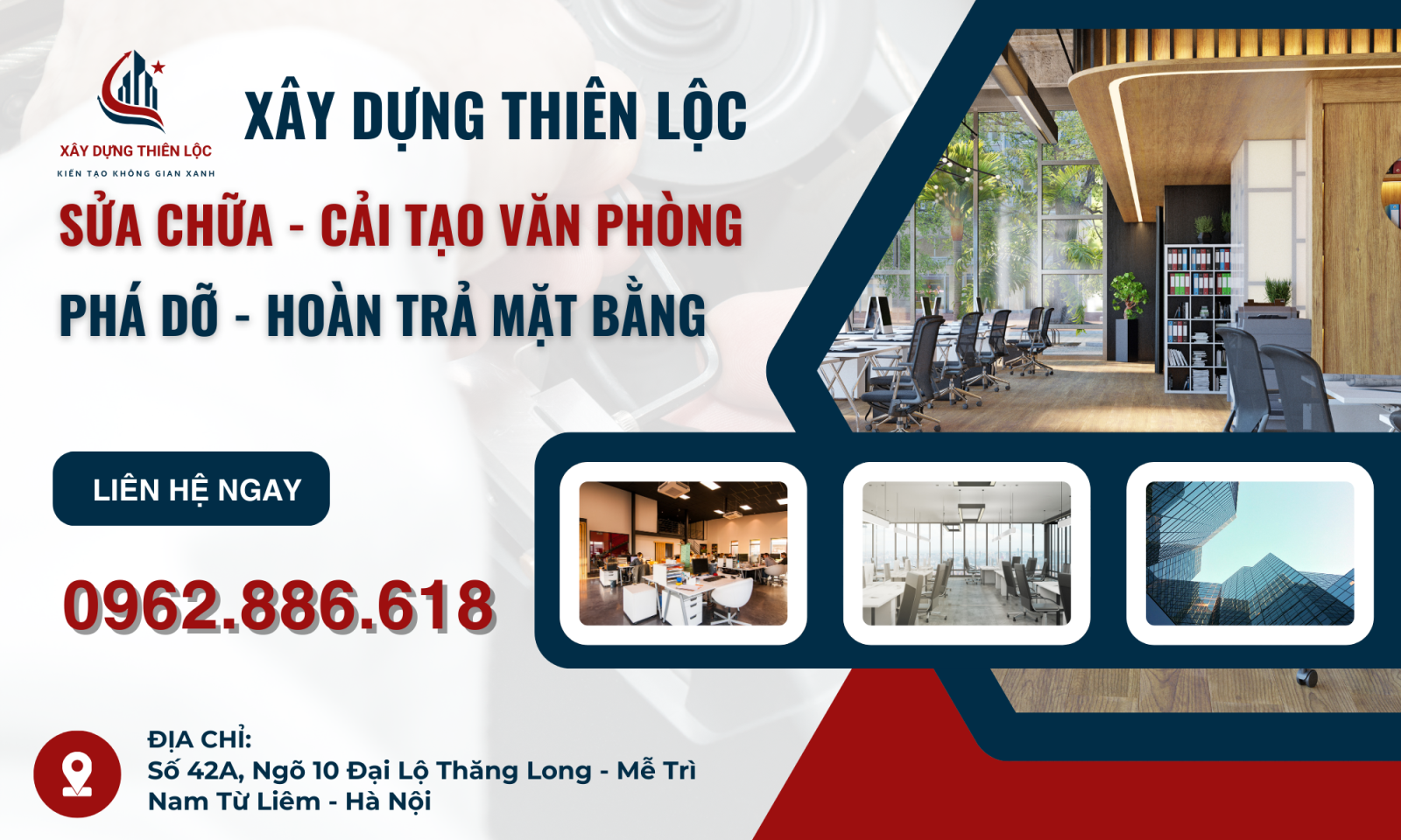 Văn phòng, toà nhà mà làm việc, nhà ở của bạn bị xuống cấp, mặt bằng không đáp ứng được công năng, vận hành của doanh nghiệp. Vì thế sửa chữa cải tạo văn phòng trọn gói là một phương án hoàn hảo để làm mới lại văn phòng, nâng cao hình ảnh, bộ mặt doanh nghiệp của mình. Hãy hợp tác làm việc với chúng tôi với dịch vụ cải tạo văn phòng, toàn nhà làm việc, nhà ở tại Hà Nội. Công ty Thiên Lộc sẽ đồng hành cùng với quý khách từ giai đoạn ý tưởng thiết kế cho đến hoàn thành nghiệm thu công trình. Miễn phí khảo sát, tư vấn kỹ thuật cho khách hàng về hạng mục